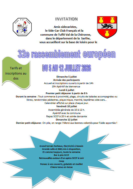 Le Side-Car Club Français, avec le soutien de la commune de Tuffé – Val de la Chéronne (Sarthe), vous donne rendez-vous pour son 32ᵉ rassemblement européen du 5 au 12 juillet 2026.